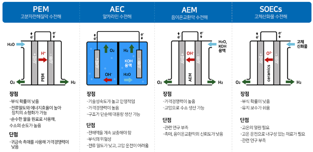 ② 그린수소의 경우 고체 전해질막(PEM) 수전해는 태양광, 풍력 등 재생에너지를 통해 순수 물을 원료로 전기 화학적 분해 반응을 일으켜 수소와 산소를 생산하는 기술